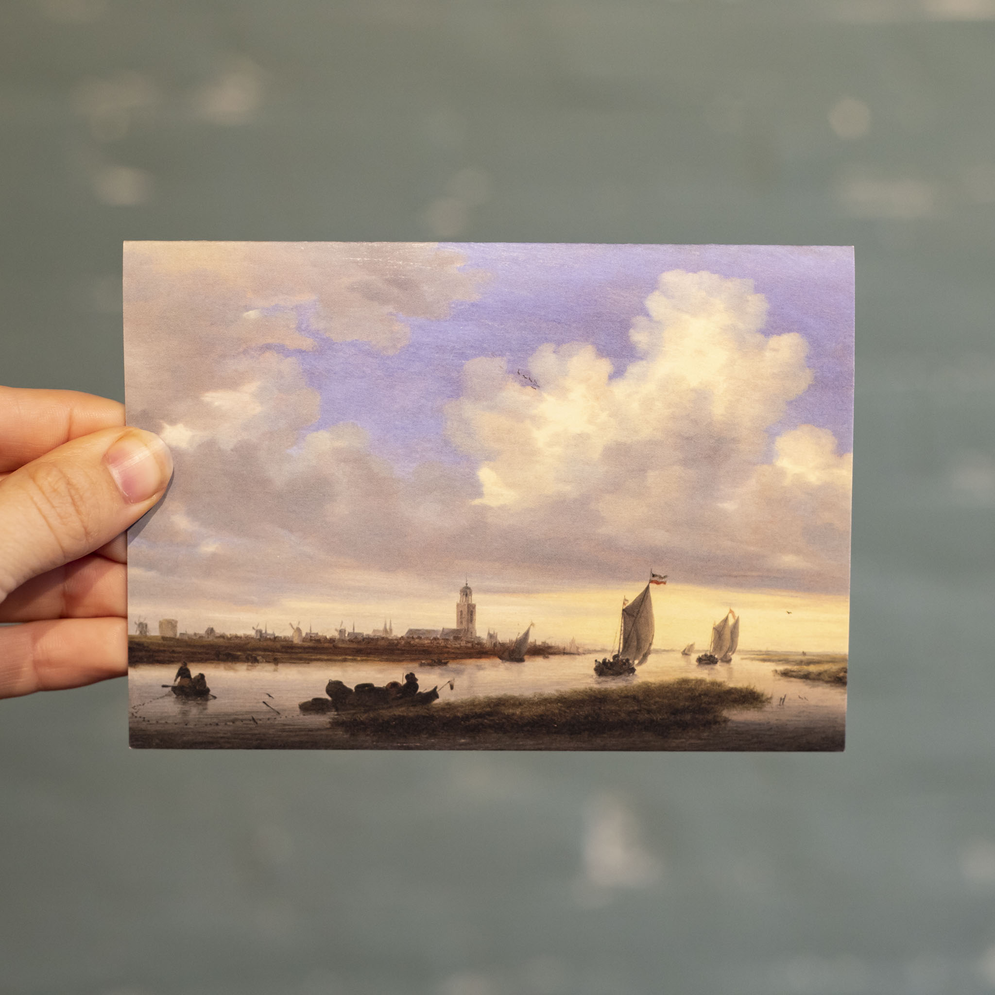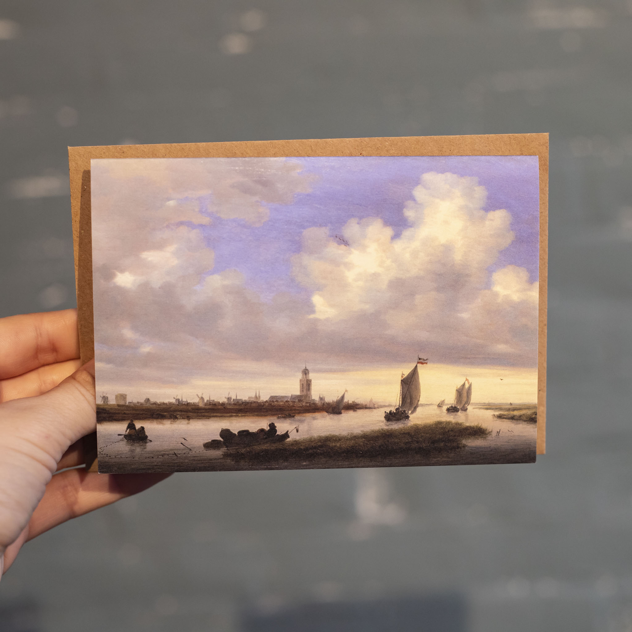 Het iconische ‘Gezicht op Deventer gezien vanuit het Noordwesten’ van landschapsschilder Salomon van Ruysdael (uit de Gouden Eeuw), vereeuwigd op een kaartje.